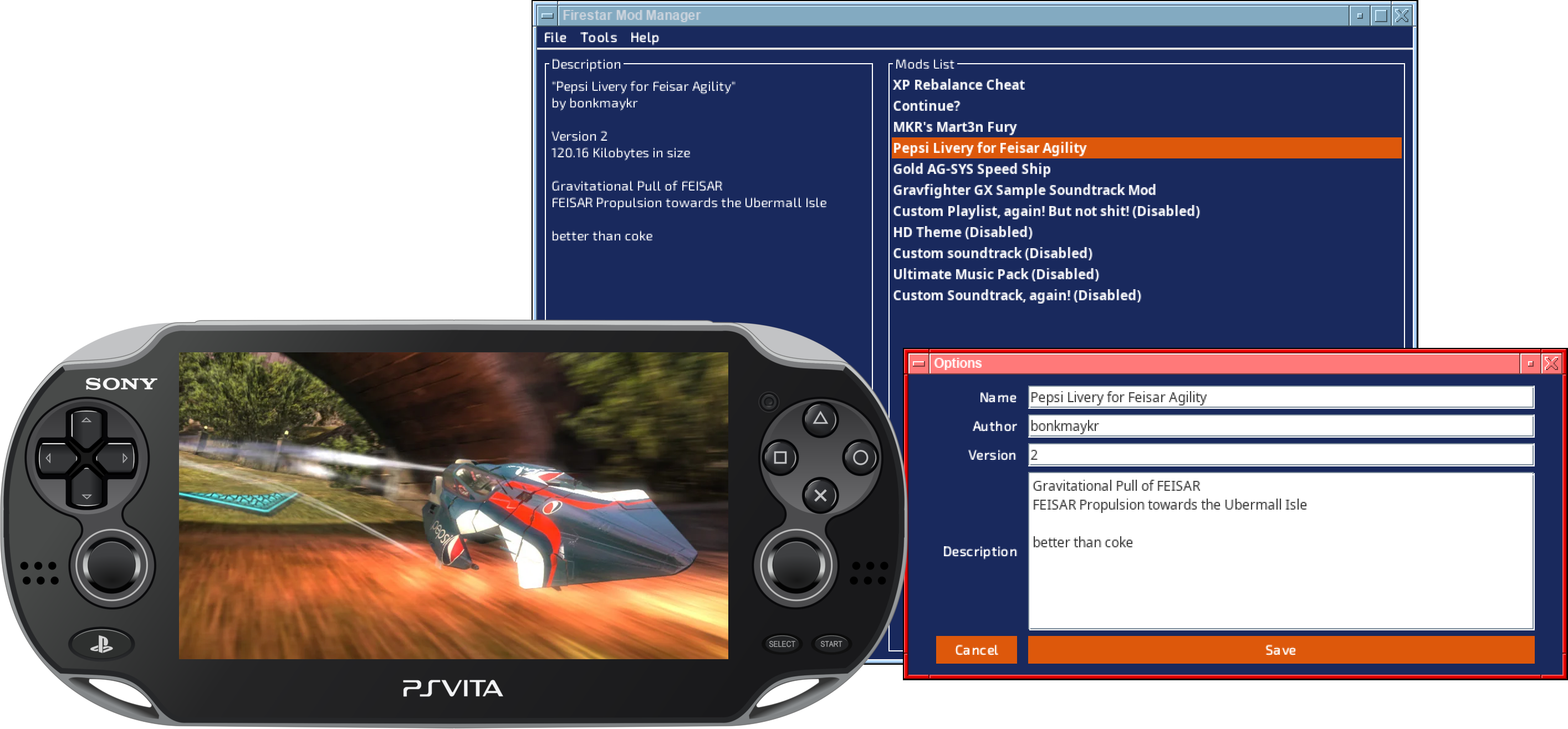 Firestar is a desktop program that helps organize and manage mods for the game WipEout 2048 on a connected Playstation Vita or PS TV game system. It automates many of Sony's developer tools used to alter the game files and it makes setting up new mods much more convenient than it would be installing them by hand.